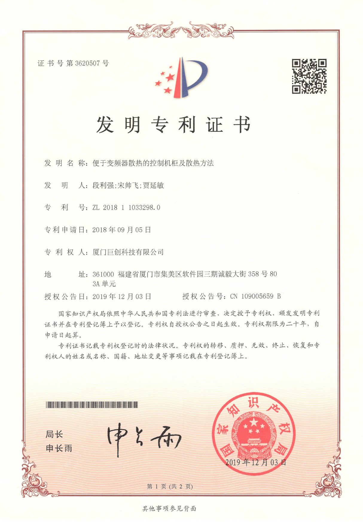 公司目前共有發(fā)明專利、實用新型、軟著等合計39項,發(fā)明專利“便于變頻器散熱的控制機柜及散熱方法”為公司若干個項目成功中標(biāo)發(fā)揮了決定性的作用。
